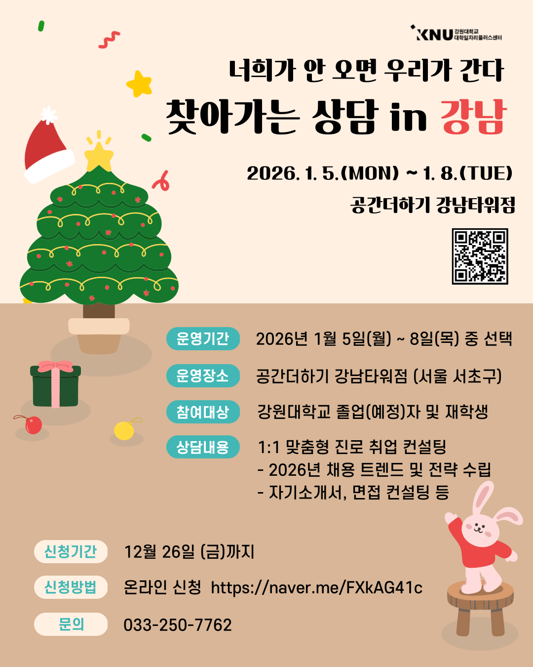 1. 2026년 대비 취업역량 강화를 위한『KNU 동계 찾아가는 상담 in 강남』을 다음과 같이 운영하오니 많은 학생들이 참여할 수 있도록 홍보하여 주시기 바랍니다.