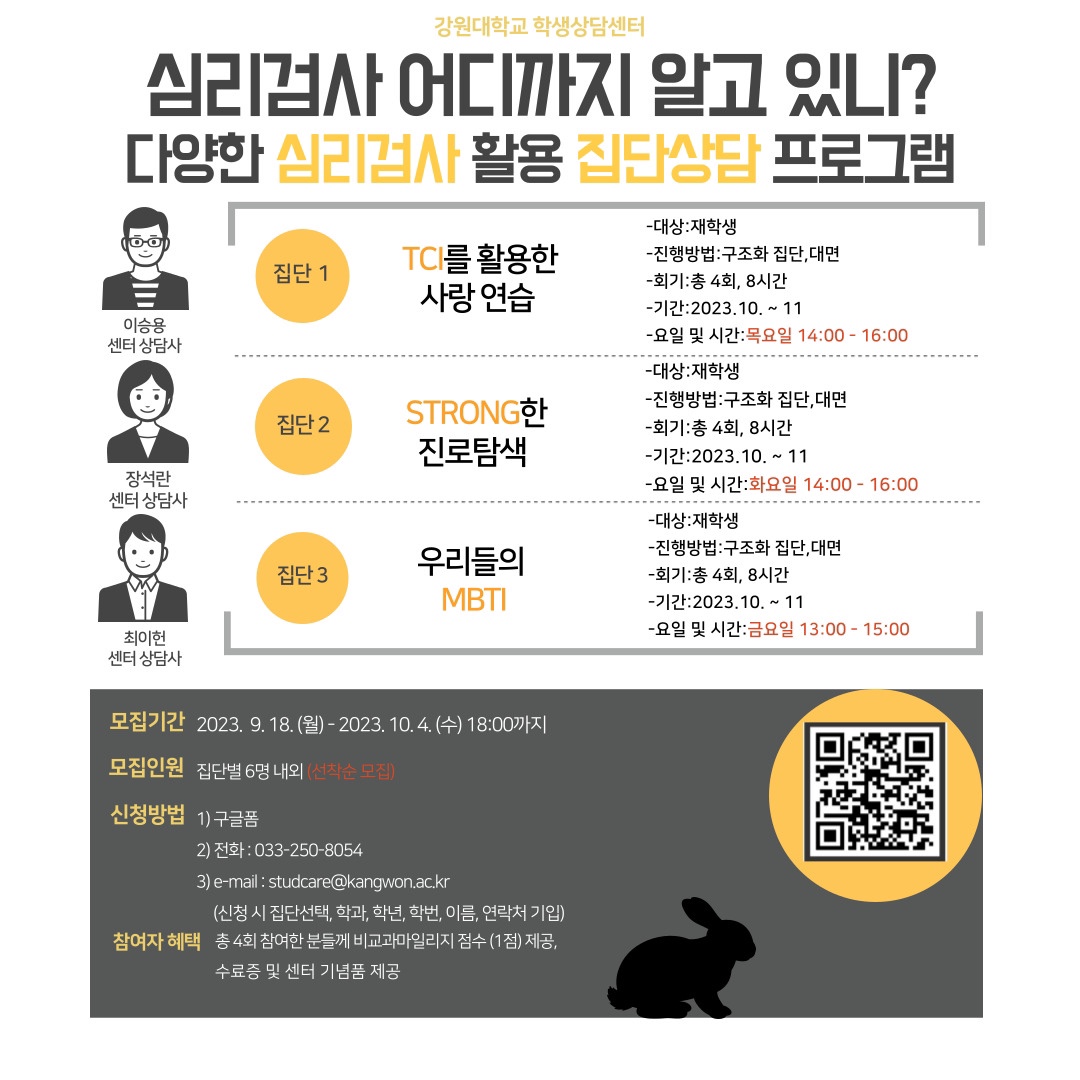 2. 위 호와 관련하여 학생상담센터에서는 다음과 같이 2023-2학기 다양한 심리검사를 활용한 집단상담을 실시하오니 귀 학과의 학생들이 참여할 수 있도록 홍보 요청드립니다.