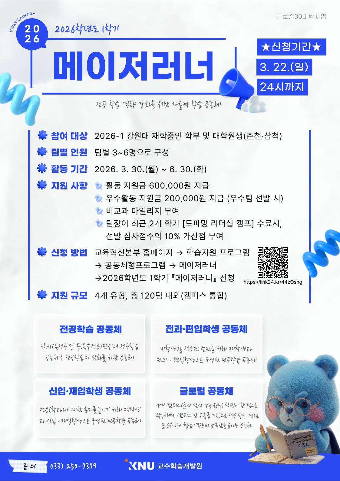 학생들이 자율적 학습 공동체 활동을 통해 자기주도적 학습 역량을 향상시키고 공동체 의식을 함양할 수 있도록 지원하기 위해 2026학년도 1학기 『메이저러너』프로그램을 다음과 같이 시행하오니 재학생에게 적극 안내하여 주시기 바랍니다.