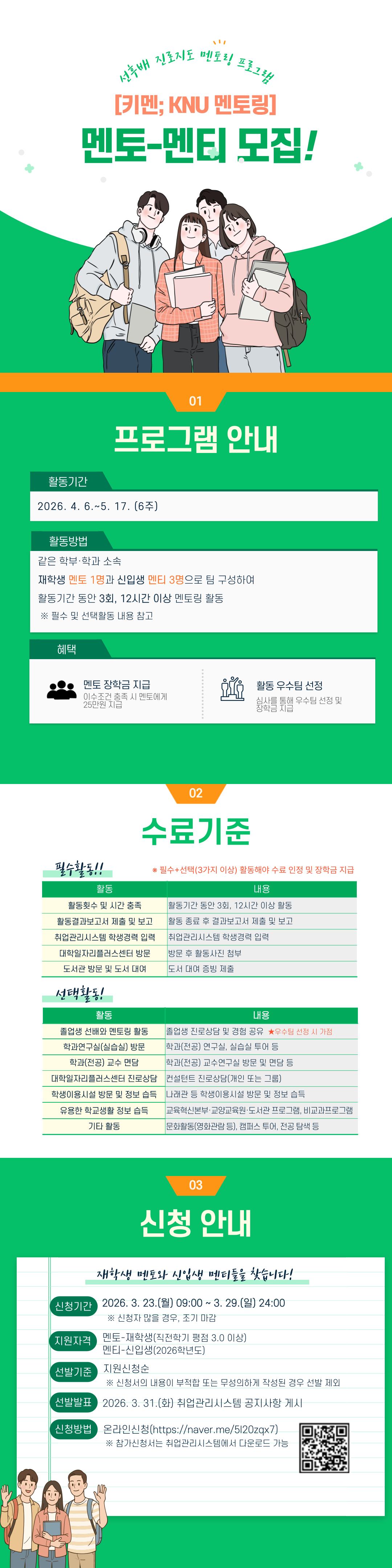 2. 재학생 및 졸업생 선배와의 교류 활동 및 경험 공유를 통해 신입생의 취업 및 진로탐색 기회를 제공하고자 선후배 진로지도 멘토링 프로그램 「키멘; KNU 멘토링」을 다음과 같이 운영하오니 학과에서는 관심 있는 학생들이 신청할 수 있도록 안내하여 주시기 바랍니다.